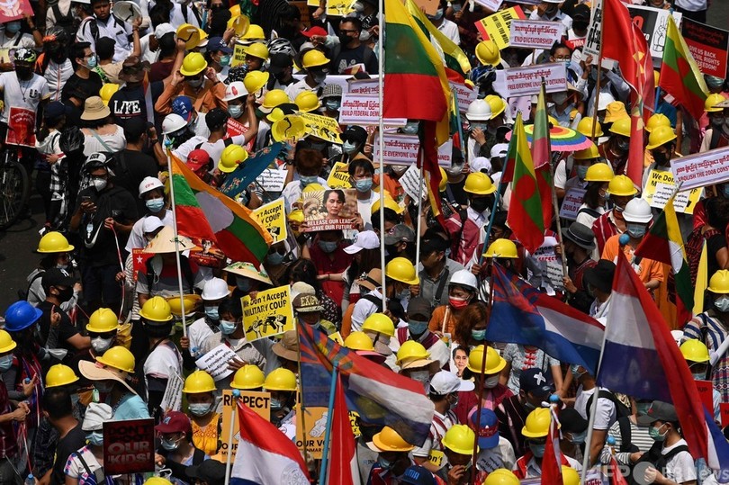 ミャンマーでは、アウン・サン・スー・チー(Aung San Suu Kyi)国家顧問率いる文民政権に対する国軍のクーデターに抗議するデモが全国各地で続いている。