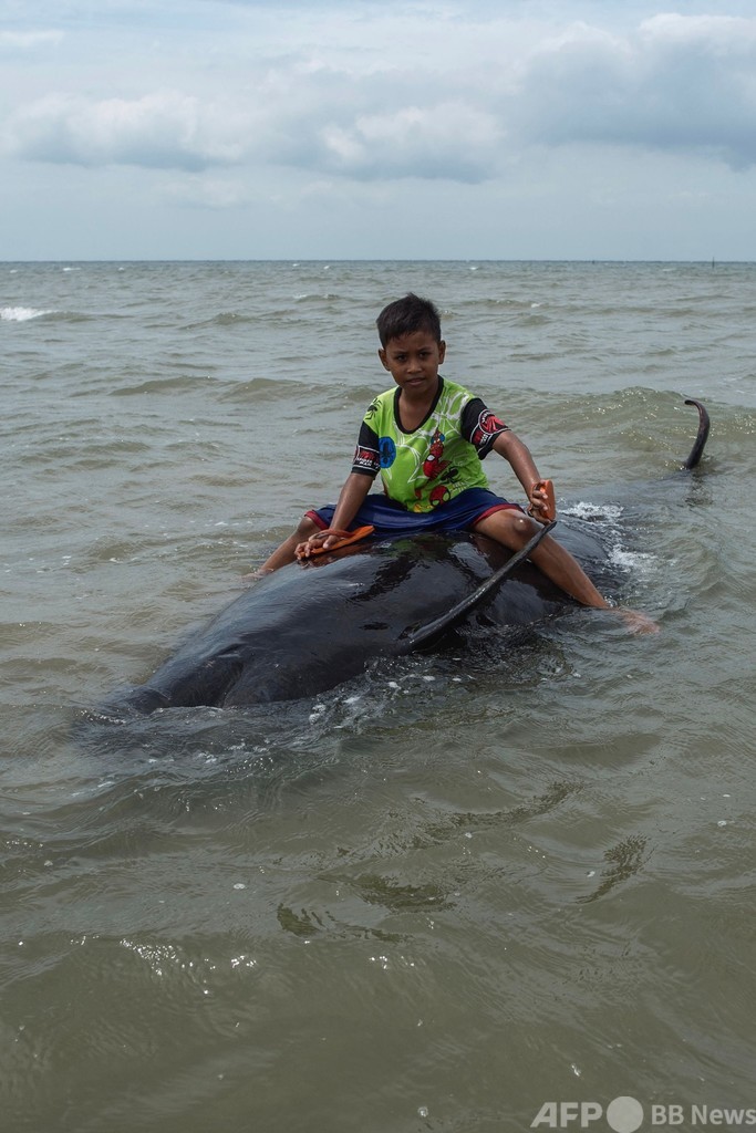 漂着したコビレゴンドウは体長3~5メートルで、18日にマドゥラ(Madura)島の浜辺に打ち上げられ始めた。周囲に大勢が集まる中、クジラを海に押し戻す救出作戦が始まったが、結局生き残ったのはわずか3頭だった。