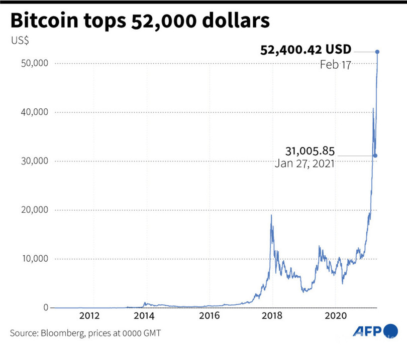 ビットコインの価格は日本時間20日午前1時25分ごろ、過去最高値の5万4182ドルを記録。仮想通貨の情報サイト「コインマーケットキャップ(coinmarketcap.com)」によると、ビットコインの発行数は1860万を超え、時価総額は1兆20億ドルとなった。(c)AFP/Roland JACKSON