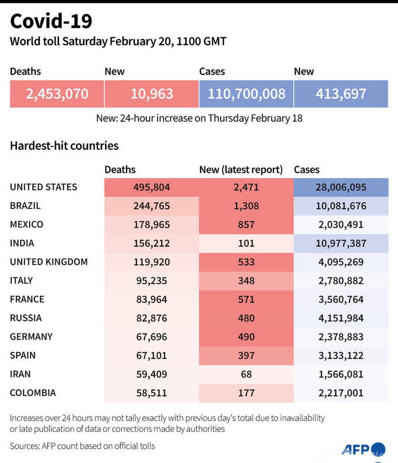 【2月20日 AFP】AFPが各国当局の発表に基づき日本時間20日午後8時にまとめた統計によると、世界の新型コロナウイルスによる死者数は245万3070人に増加した。