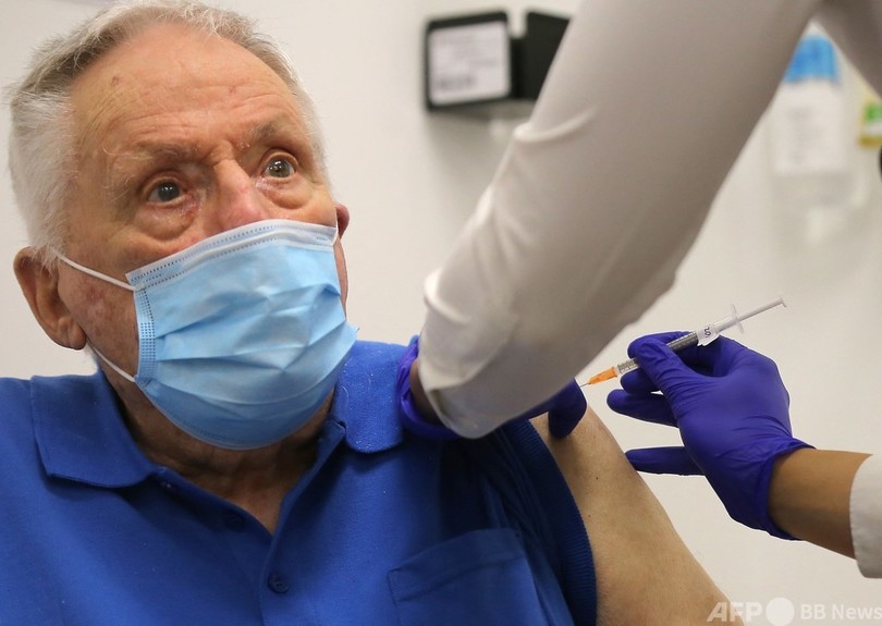 最初にワクチン接種を受けたのは、第2次世界大戦(World War II)を経験し、現在は高齢者施設で暮らす80代のジェーン・マリシアク(Jane Malysiak)さんで、医療従事者らが後に続いた。