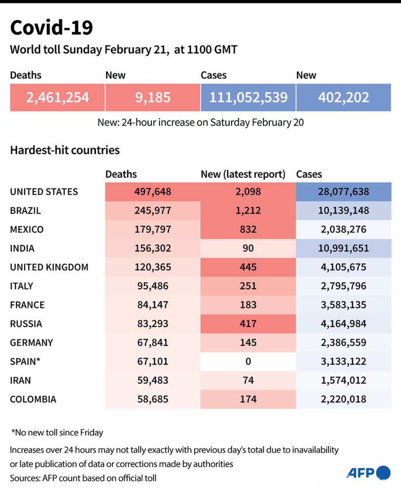 【2月22日 AFP】AFPが各国当局の発表に基づき日本時間21日午後8時にまとめた統計によると、世界の新型コロナウイルスによる死者数は246万1254人に増加した。