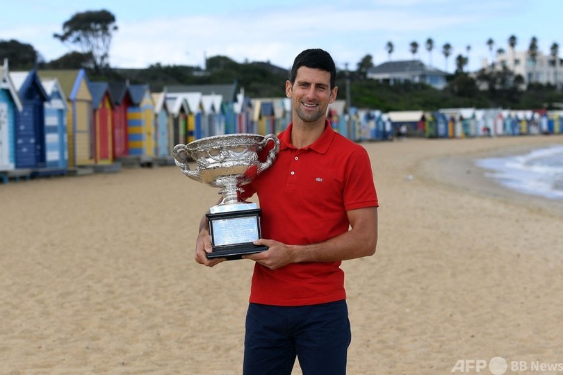 【2月22日 AFP】全豪オープンテニス(Australian Open Tennis Tournament 2021)、男子シングルスを制したノバク・ジョコビッチ(Novak Djokovic、セルビア)が22日、メルボルン市内のブライトンビーチ(Brighton Beach)で優勝トロフィーを手に写真撮影に臨んだ。