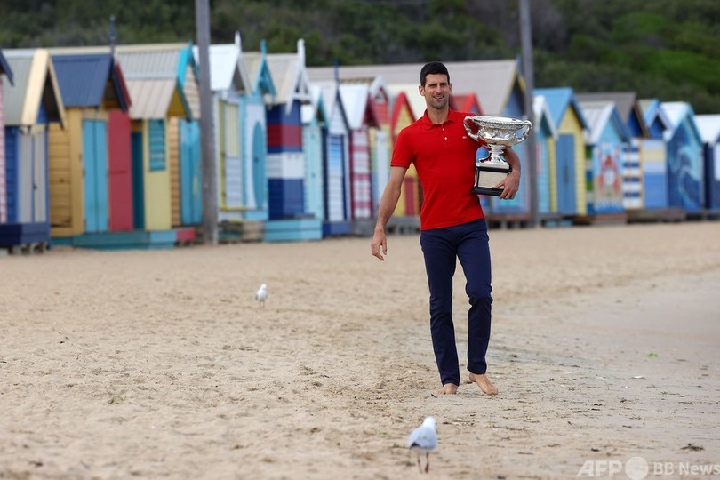 【2月22日 AFP】全豪オープンテニス(Australian Open Tennis Tournament 2021)、男子シングルスを制したノバク・ジョコビッチ(Novak Djokovic、セルビア)が22日、メルボルン市内のブライトンビーチ(Brighton Beach)で優勝トロフィーを手に写真撮影に臨んだ。