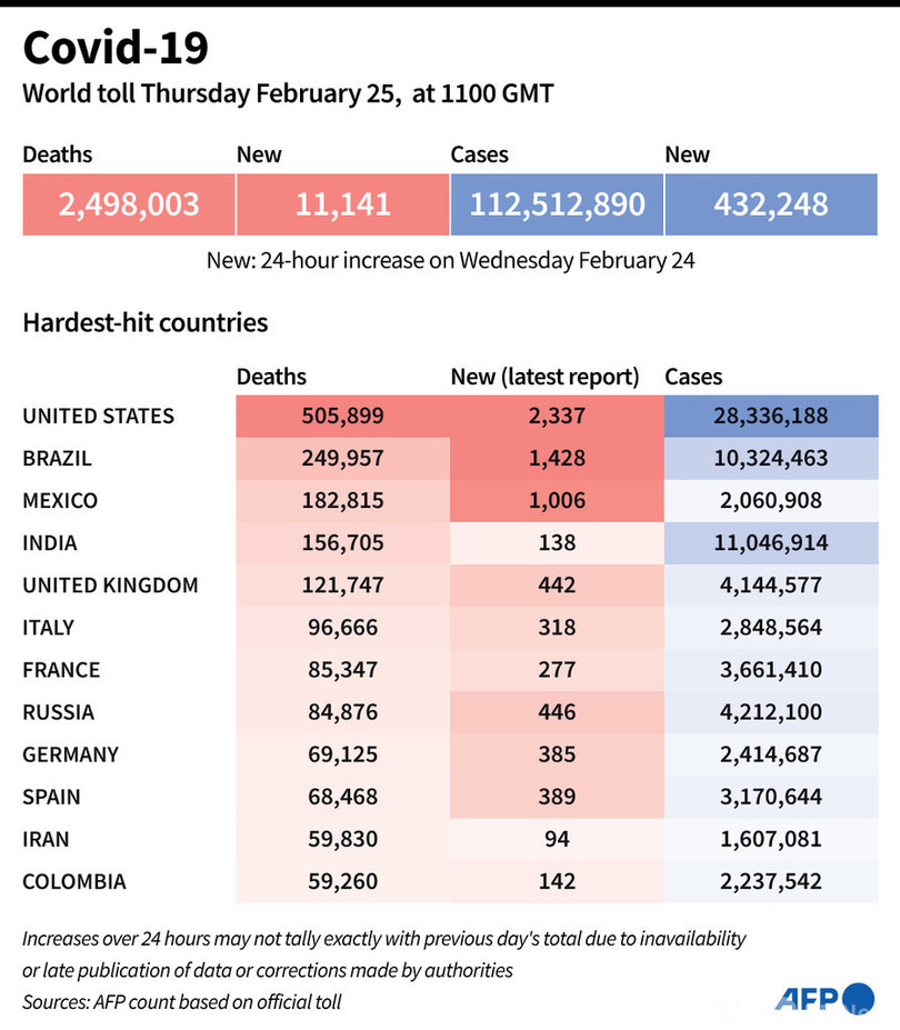 【2月26日 AFP】AFPが各国当局の発表に基づき日本時間25日午後8時にまとめた統計によると、世界の新型コロナウイルスによる死者数は249万8003人に増加した。