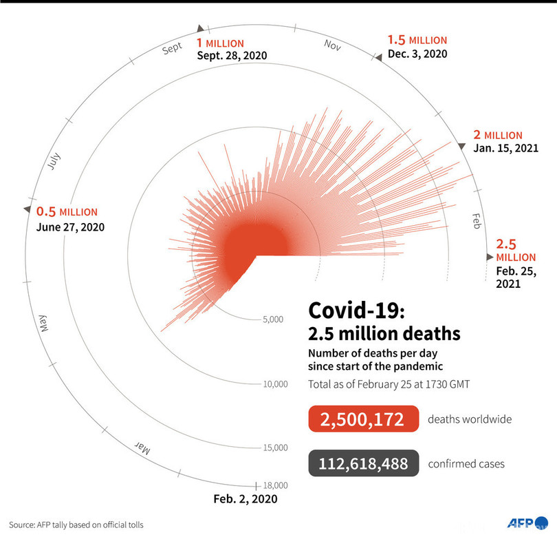 【2月26日 AFP】AFPが各国当局の発表に基づき日本時間26日午前2時半にまとめた集計によると、新型コロナウイルスの流行による世界の死者は250万人を超えた。