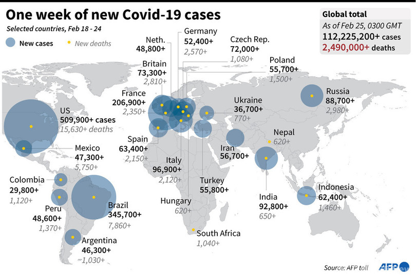 世界の死者は250万172人、感染者は累計1億1261万8488人。地域別の死者数は、欧州が84万2894人で最多、次いで中南米・カリブ海(Caribbean Sea)諸国(66万7972人)、米国・カナダ(52万8039人)の順に多い。