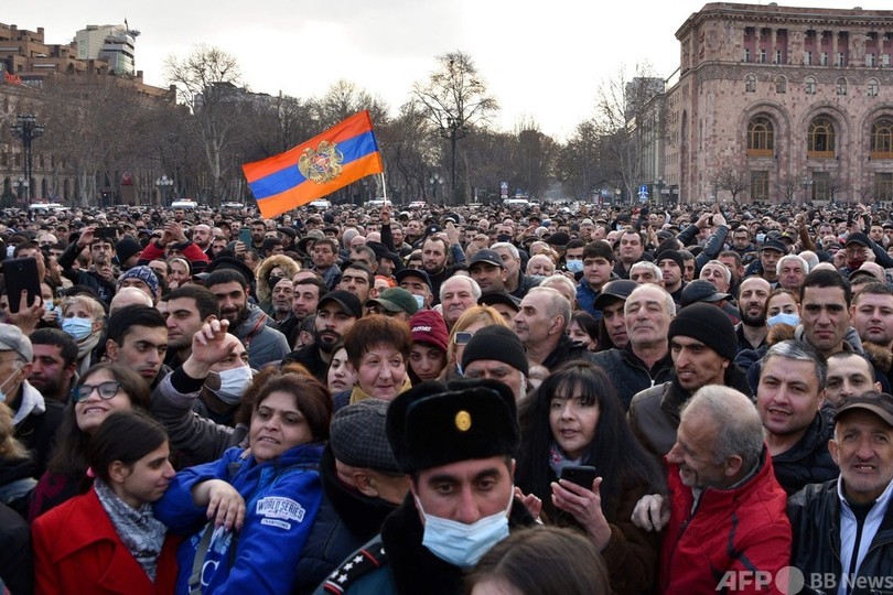 パシニャン首相に対しては、係争地ナゴルノカラバフ(Nagorno-Karabakh)をめぐり隣国アゼルバイジャンとの間で昨年起きた軍事衝突での対応が批判され、国内で圧力が強まっていた。軍参謀本部はこれまでパニシャン氏を支持していたが、この日発表した声明では一転して内閣総辞職を要求。パニシャン氏は、自身を追放するたくらみだとして反発し、数時間後にエレバン中心部で支持者約2万人が参加する集会を開いた。