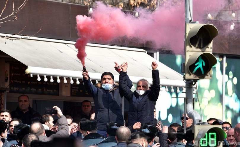 パシニャン首相に対しては、係争地ナゴルノカラバフ(Nagorno-Karabakh)をめぐり隣国アゼルバイジャンとの間で昨年起きた軍事衝突での対応が批判され、国内で圧力が強まっていた。軍参謀本部はこれまでパニシャン氏を支持していたが、この日発表した声明では一転して内閣総辞職を要求。パニシャン氏は、自身を追放するたくらみだとして反発し、数時間後にエレバン中心部で支持者約2万人が参加する集会を開いた。