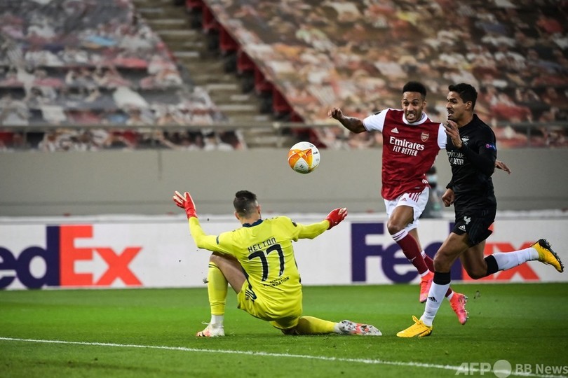 ベンフィカ(Benfica)との第1戦を1-1で引き分けていたアーセナルは、ピエール・エメリク・オーバメヤン(Pierre-Emerick Aubameyang)の決勝ゴールを含む2得点の活躍などで3-2で勝利し、2戦合計4-3で勝ち上がりを決めた。