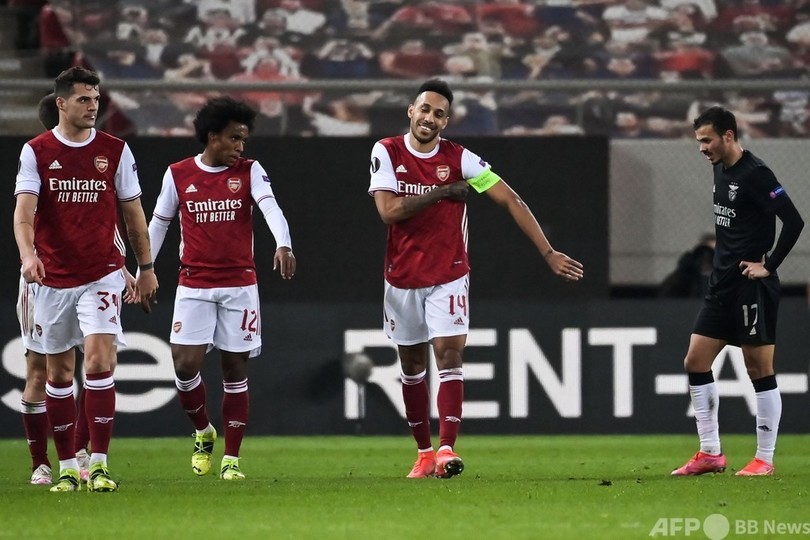 ベンフィカ(Benfica)との第1戦を1-1で引き分けていたアーセナルは、ピエール・エメリク・オーバメヤン(Pierre-Emerick Aubameyang)の決勝ゴールを含む2得点の活躍などで3-2で勝利し、2戦合計4-3で勝ち上がりを決めた。