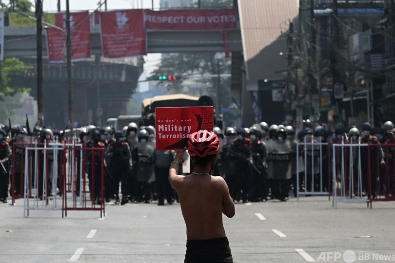 【2月26日 AFP】(更新)ミャンマーの最大都市ヤンゴンで、アウン・サン・スー・チー(Aung San Suu Kyi)国家顧問を拘束した軍事政権に対する抗議デモが続いている。26日には機動隊が出動し、参加者らを解散させた。
