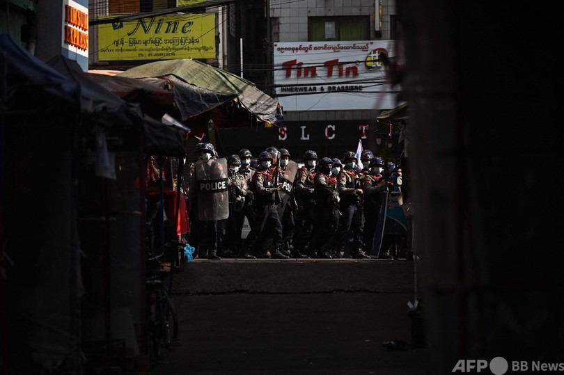 【2月26日 AFP】(更新)ミャンマーの最大都市ヤンゴンで、アウン・サン・スー・チー(Aung San Suu Kyi)国家顧問を拘束した軍事政権に対する抗議デモが続いている。26日には機動隊が出動し、参加者らを解散させた。