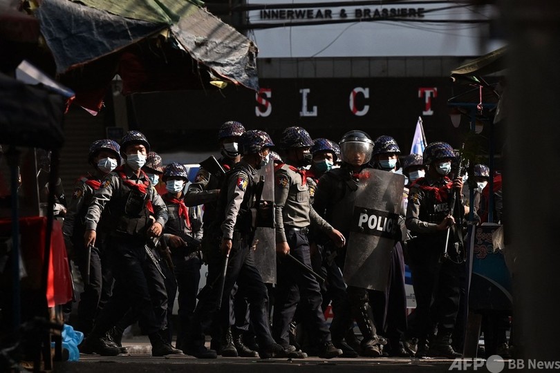 【2月26日 AFP】(更新)ミャンマーの最大都市ヤンゴンで、アウン・サン・スー・チー(Aung San Suu Kyi)国家顧問を拘束した軍事政権に対する抗議デモが続いている。26日には機動隊が出動し、参加者らを解散させた。