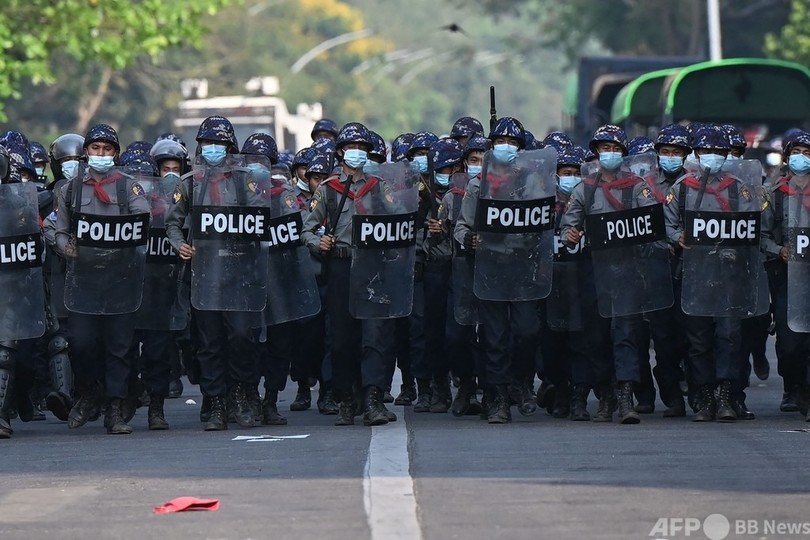 【2月26日 AFP】(更新)ミャンマーの最大都市ヤンゴンで、アウン・サン・スー・チー(Aung San Suu Kyi)国家顧問を拘束した軍事政権に対する抗議デモが続いている。26日には機動隊が出動し、参加者らを解散させた。