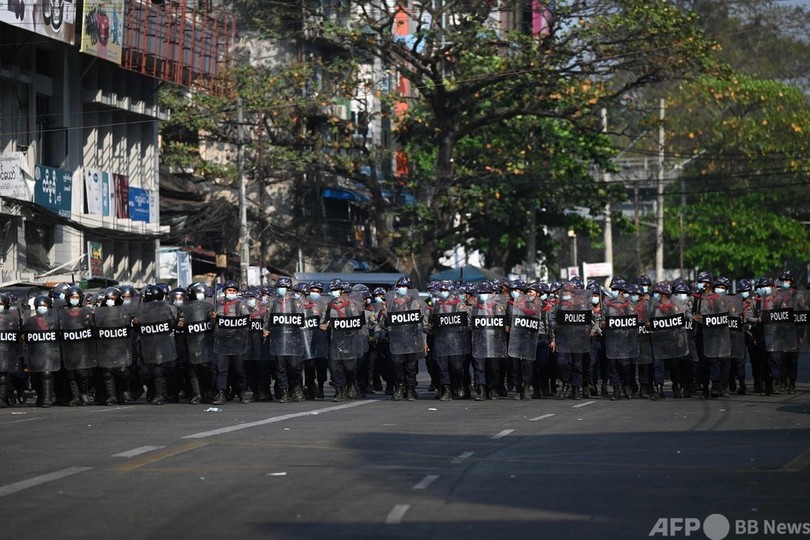 【2月26日 AFP】(更新)ミャンマーの最大都市ヤンゴンで、アウン・サン・スー・チー(Aung San Suu Kyi)国家顧問を拘束した軍事政権に対する抗議デモが続いている。26日には機動隊が出動し、参加者らを解散させた。