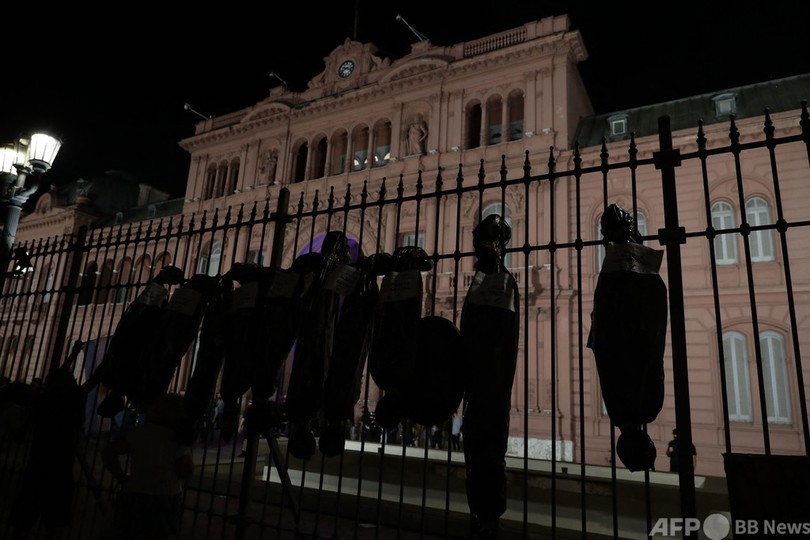 デモ隊は大統領府カサ・ロサダ(Casa Rosada)前の柵に、遺体袋を模した黒い袋をつり下げて抗議。袋にはワクチン接種を受けた政権に近い有力者の名前が書かれた。デモ隊の行為について、フェルナンデス大統領はツイッター(Twitter)で、「民主主義のもとで行うデモの方法は、政治的指導者の名前のある遺体袋をカサ・ロサダに並べることであってはならない」と非難。この行為に「遺憾」を表明し、「野蛮な行為に黙っていてはいけない」と呼び掛けた。(c)AFP
