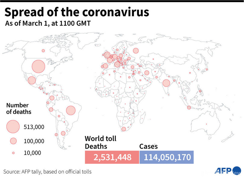 【3月2日 AFP】AFPが各国当局の発表に基づき日本時間1日午後8時にまとめた統計によると、世界の新型コロナウイルスによる死者数は253万1448人に増加した。