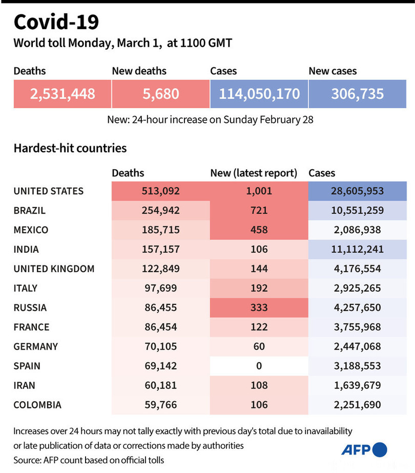 【3月2日 AFP】AFPが各国当局の発表に基づき日本時間1日午後8時にまとめた統計によると、世界の新型コロナウイルスによる死者数は253万1448人に増加した。