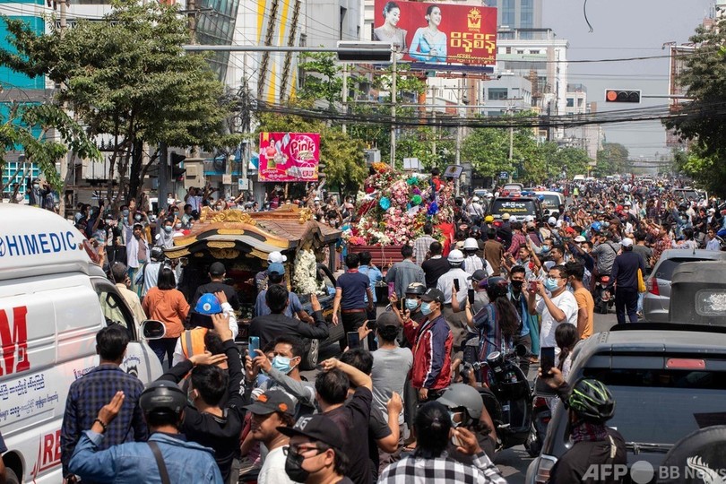 4日午前には、人々が花束や花輪を手にひつぎの前に列をつくり、ミャンマーで広く歌われる革命歌「この世の終わりまで忘れない」を歌った。