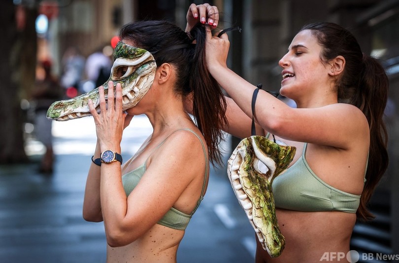 【3月14日 AFP】豪シドニーにある仏ファッションブランド「エルメス(Hermes)」の店先で、ビキニとクロコダイルの仮面を着ける動物愛護団体「動物の倫理的扱いを求める人々の会(PETA)」の活動家たち。