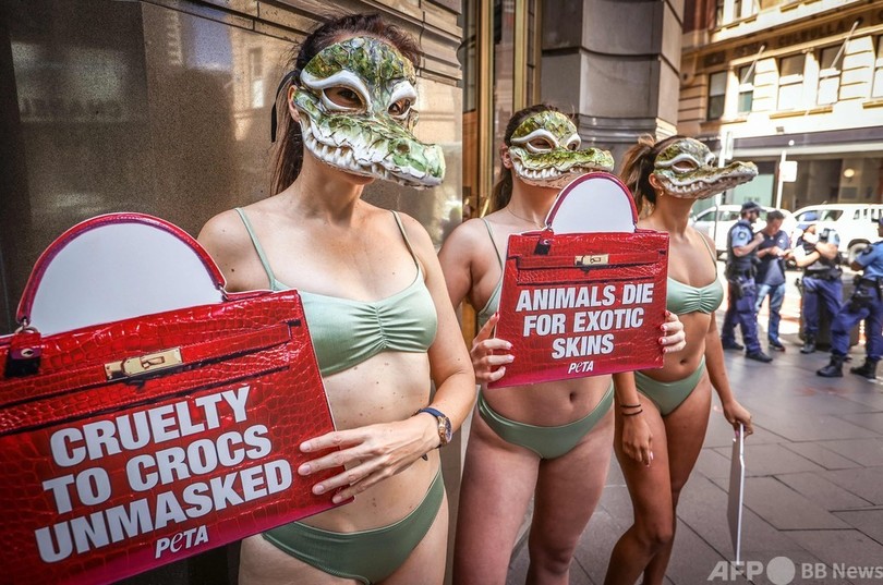 【3月14日 AFP】豪シドニーにある仏ファッションブランド「エルメス(Hermes)」の店先で、ビキニとクロコダイルの仮面を着ける動物愛護団体「動物の倫理的扱いを求める人々の会(PETA)」の活動家たち。