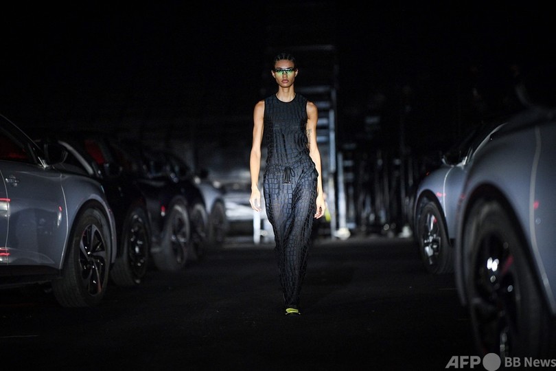 【3月16日 AFP】仏ファッションブランド「コペルニ(Coperni)」の新作を着たモデル。ショーの来場者は、ドライブインに見立てた会場で電気自動車の中からキャットウオークを眺めた。仏パリのベルシー・アリーナ(Bercy Arena)で。(c)AFP