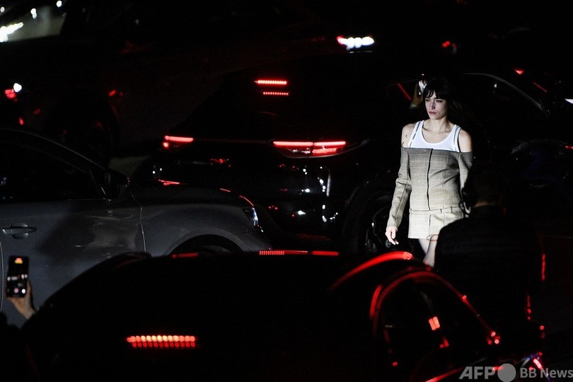 【3月16日 AFP】仏ファッションブランド「コペルニ(Coperni)」の新作を着たモデル。ショーの来場者は、ドライブインに見立てた会場で電気自動車の中からキャットウオークを眺めた。仏パリのベルシー・アリーナ(Bercy Arena)で。(c)AFP