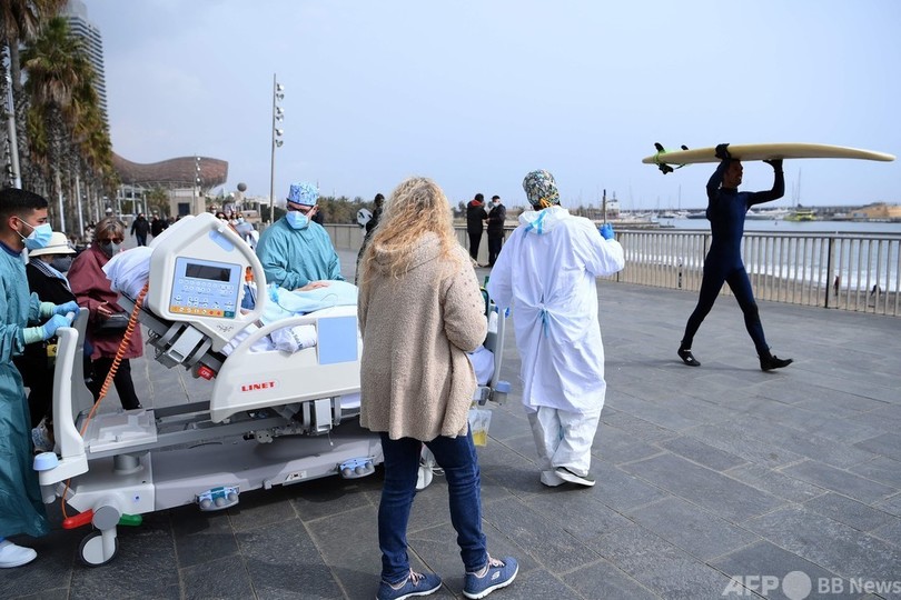 【3月15日 AFP】スペイン・バルセロナ(Barcelona)で、病院の近くにあるバルセロネータ(Barceloneta)海岸の遊歩道で、友人、近所の人、医療従事者に囲まれ、新鮮な外の空気を吸う新型コロナウイルス感染症(COVID-19)の患者のマルタ・パスクアル(Marta Pascual)さん(72)。(c)AFP