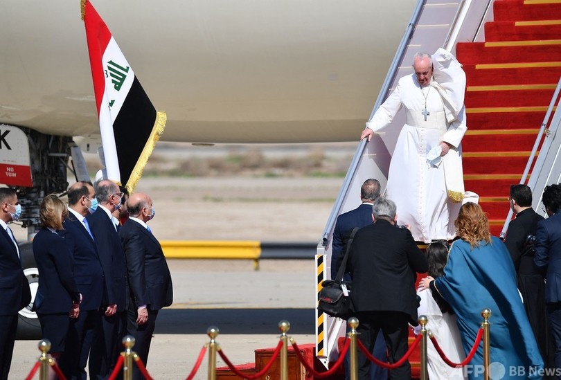 【3月5日 AFP】(更新、写真追加)ローマ・カトリック教会のフランシスコ教皇(Pope Francis、84)は5日、歴代ローマ教皇で初となるイラク訪問を開始した。教皇は、長年にわたる紛争に加え、現在は新型コロナウイルスの流行に見舞われている同国で行った最初の演説で、過激主義や暴力の終結を訴えた。