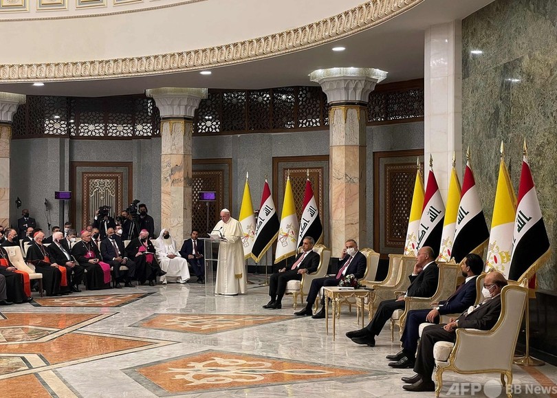 フランシスコ教皇の外遊は、新型ウイルスのパンデミック(世界的な大流行)が始まってから初めて。教皇は大統領府で行った演説で「暴力行為や過激主義、党争、不寛容に終わりを!」と訴えるとともに、贈収賄が横行するイラクの当局者らに対し「汚職や権力乱用、法の軽視と闘う」よう呼び掛けた。