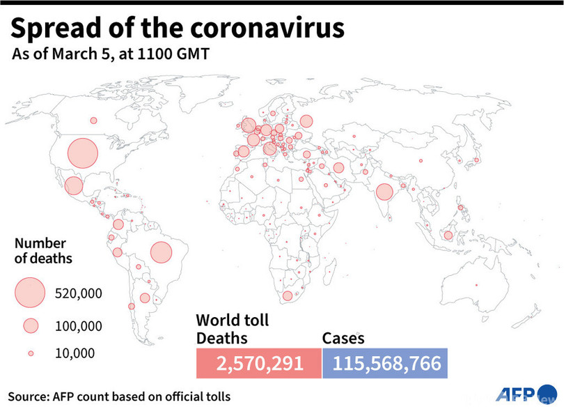 【3月6日 AFP】AFPが各国当局の発表に基づき日本時間5日午後8時にまとめた統計によると、世界の新型コロナウイルスによる死者数は257万291人に増加した。