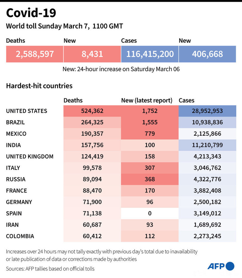 【3月8日 AFP】AFPが各国当局の発表に基づき日本時間7日午後8時にまとめた統計によると、世界の新型コロナウイルスによる死者数は258万8597人に増加した。