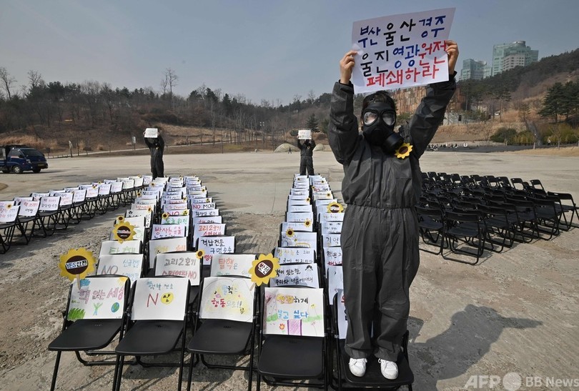 【3月11日 AFP】韓国ソウルの公園で11日、2011年3月11日に発生した福島第1原子力発電所事故から10年になるのに合わせて、脱原発デモが行われた。ガスマスク姿の環境活動家が「福島を忘れるな!」や「原発を閉鎖せよ!」などと書かれたプラカードを手に参加した。(c)AFP