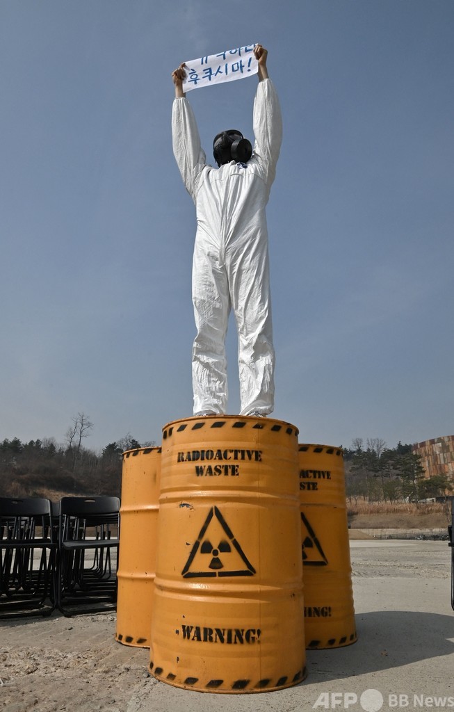 【3月11日 AFP】韓国ソウルの公園で11日、2011年3月11日に発生した福島第1原子力発電所事故から10年になるのに合わせて、脱原発デモが行われた。ガスマスク姿の環境活動家が「福島を忘れるな!」や「原発を閉鎖せよ!」などと書かれたプラカードを手に参加した。(c)AFP