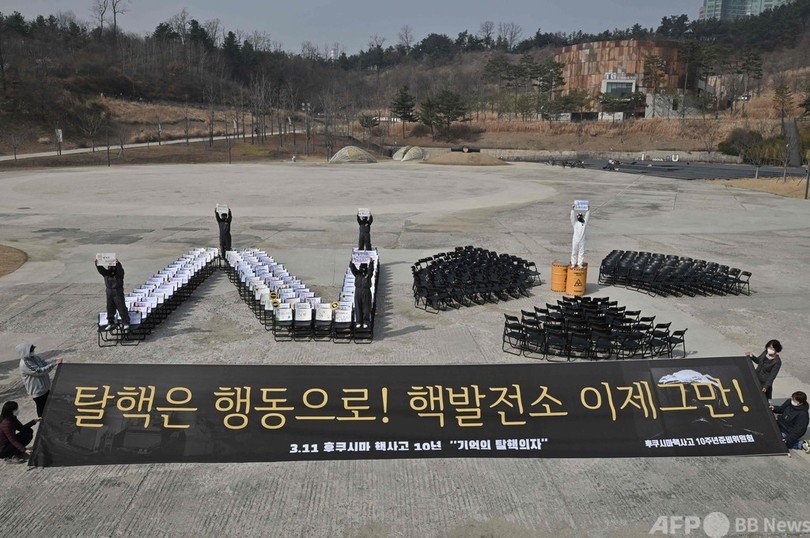 【3月11日 AFP】韓国ソウルの公園で11日、2011年3月11日に発生した福島第1原子力発電所事故から10年になるのに合わせて、脱原発デモが行われた。ガスマスク姿の環境活動家が「福島を忘れるな!」や「原発を閉鎖せよ!」などと書かれたプラカードを手に参加した。(c)AFP