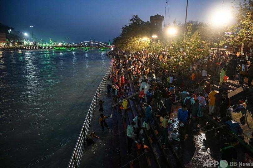 ヒマラヤ山脈(Himalayas)の麓にある聖地ハリドワールのガンジス川の岸辺は夜明け前、沐浴の場所を確保しようと老若男女が、数キロにわたりひしめき合っていた。巡礼者らは流れの速い川に身を沈めると祝詞を唱え、花を散らした。