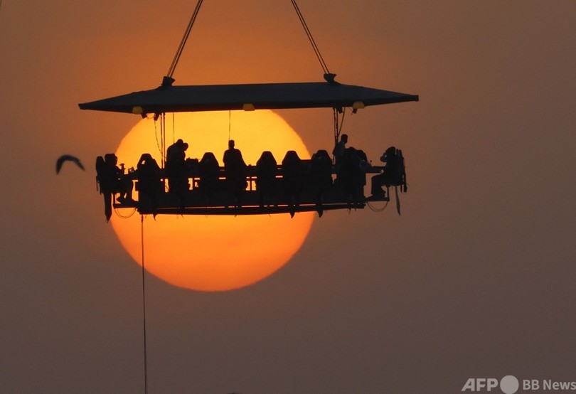 【3月20日 AFP】クレーンでテーブルを地上50メートルまでつり上げたレストラン「ディナー・イン・ザ・スカイ(Dinner in the Sky)」で食事をする人々。アラブ首長国連邦(UAE)のドバイ (Dubai)で。(c)AFP