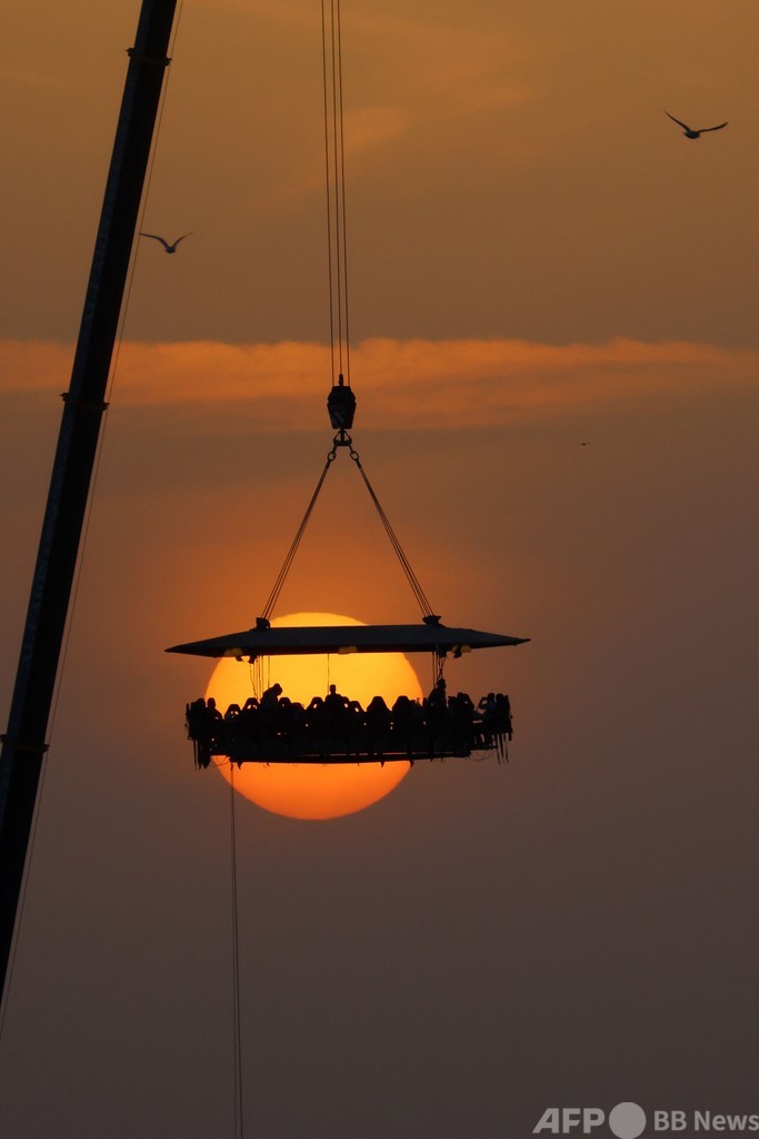 【3月20日 AFP】クレーンでテーブルを地上50メートルまでつり上げたレストラン「ディナー・イン・ザ・スカイ(Dinner in the Sky)」で食事をする人々。アラブ首長国連邦(UAE)のドバイ (Dubai)で。(c)AFP