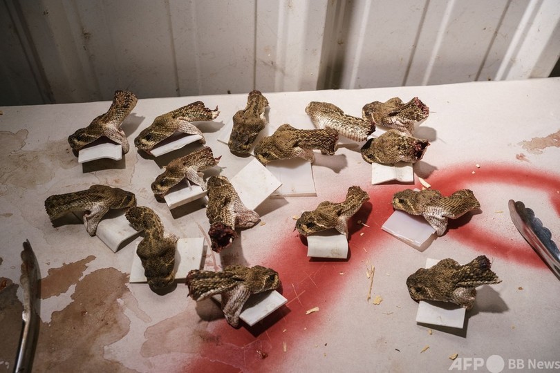 米テキサス州スイートウオーターのガラガラヘビ駆除イベントで、保存用に切り落とされた多数のニシダイヤガラガラヘビの頭(2021年3月13日撮影)。(c)PAUL RATJE / AFP