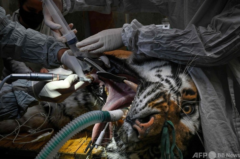 ニュース ライフ お口開けて~! シベリアトラに歯科手術、フランス 2021年3月18日 11:56 発信地:ミュルーズ/フランス [ フランス ヨーロッパ ] このニュースをシェア ‹ › ❮ 1/17 ❯ フランス東部ミュルーズにあるミュルーズ動植物公園で、牙の治療のため手術を受けるシベリアトラのバイカル(2021年3月17日撮影)。(c)SEBASTIEN BOZON / AFP 画像作成中 ! 【3月18日 AFP】フランス東部ミュルーズ(Mulhouse)にある動植物公園で17日、14歳のシベリアトラ(アムールトラ)のバイカル(Baikal)に歯科手術が行われた。7年前に折れた牙の治療痕が化膿(かのう)してしまったためという。バイカルはX線検査の後、外科手術を受けた。(c)AFP ライフ 一覧へ> メディア・報道関係・法人の方向け 写真・動画 購入のお問合せ>
