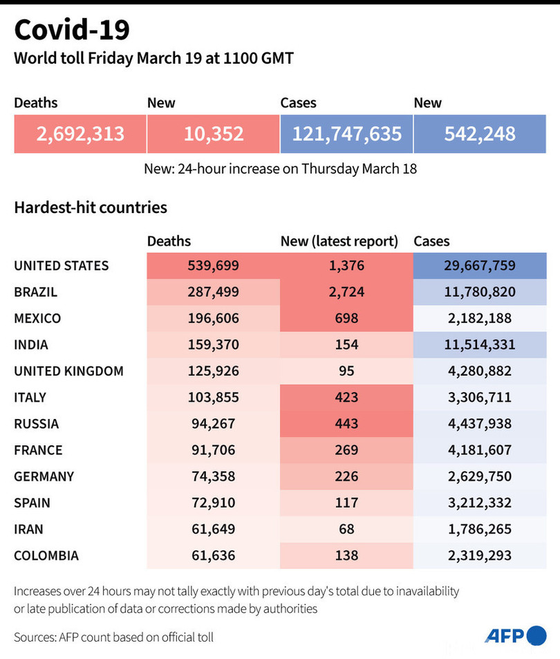 【3月20日 AFP】AFPが各国当局の発表に基づき日本時間19日午後8時にまとめた統計によると、世界の新型コロナウイルスによる死者数は269万2313人に増加した。