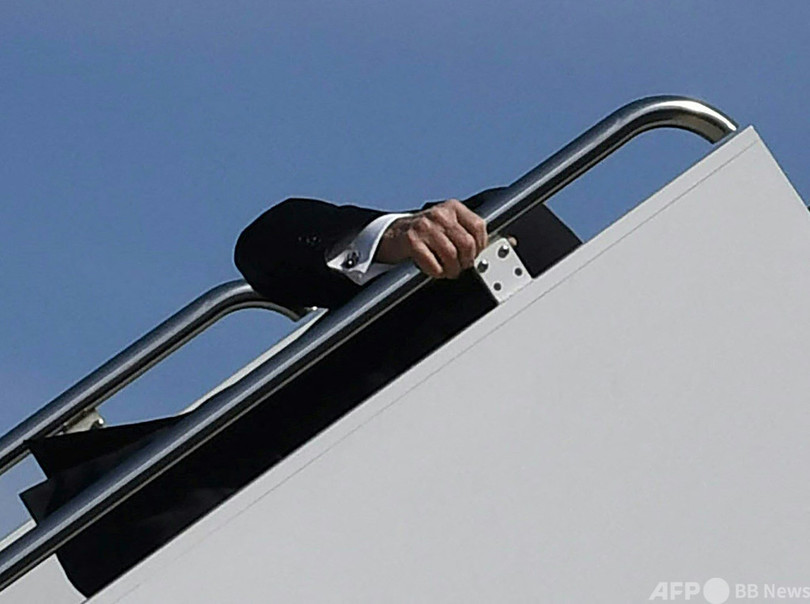 立ち上がったバイデン氏は左脚をはたき、再び階段を上り始めた。上りきると振り返って敬礼し、専用機に乗り込んだ。