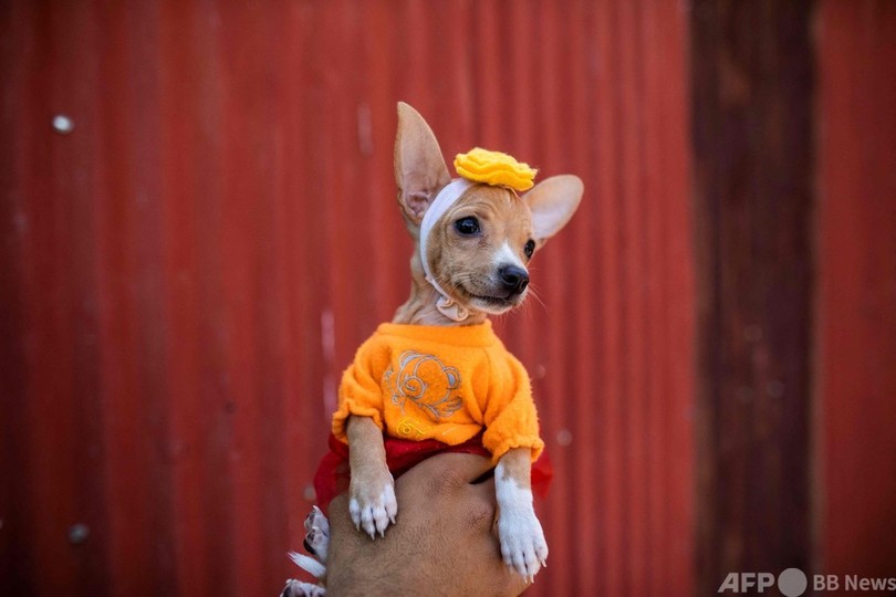 ニカラグアでは、飼い主が聖ラザロに犬の健康を祈願し、そのお礼に犬を着飾り、ミサに参加させる伝統がある。(c)AFP