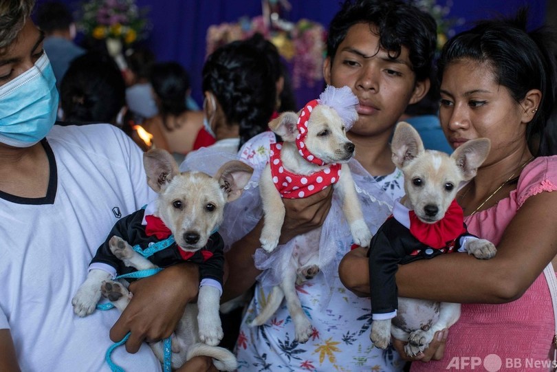 ニカラグアでは、飼い主が聖ラザロに犬の健康を祈願し、そのお礼に犬を着飾り、ミサに参加させる伝統がある。(c)AFP