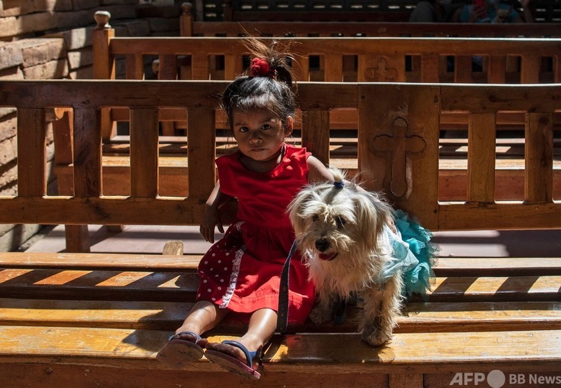 ニカラグアでは、飼い主が聖ラザロに犬の健康を祈願し、そのお礼に犬を着飾り、ミサに参加させる伝統がある。(c)AFP