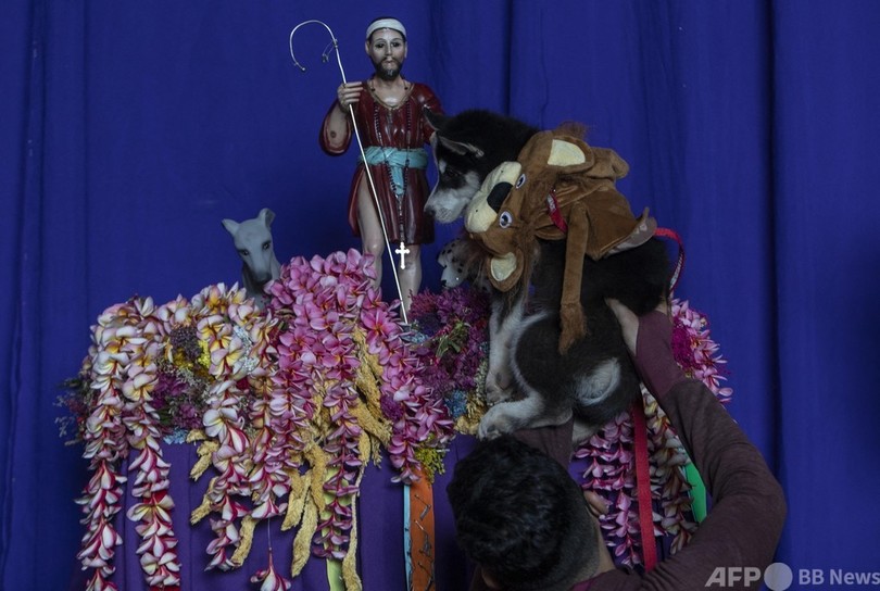 ニカラグアでは、飼い主が聖ラザロに犬の健康を祈願し、そのお礼に犬を着飾り、ミサに参加させる伝統がある。(c)AFP