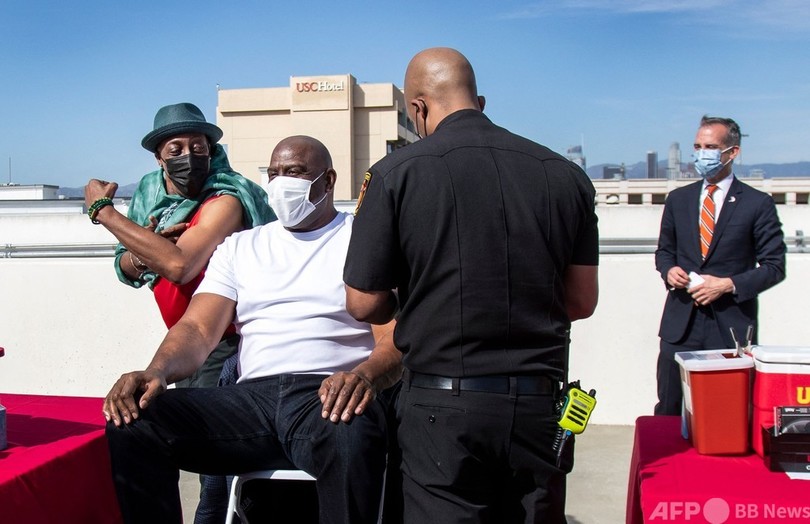 【3月25日 AFP】米カリフォルニア州ロサンゼルスで24日、元米プロバスケットボール(NBA)のスター、マジック・ジョンソン(Magic Johnson)さんと米俳優アーセニオ・ホール(Arsenio Hall)さん、ダニー・トレホ(Danny Trejo)さんの3人が一緒に、新型コロナウイルスワクチンの接種を受けた。