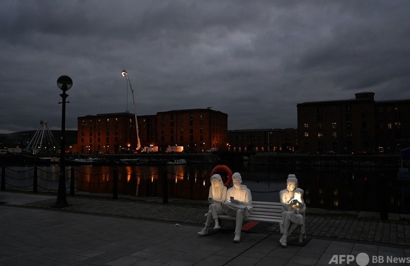 【4月4日 AFP】アートイベント「光の川(River of Light)」の内覧会で、アーティストのガリ・メイ・ルーカス(Gali May Lucas)さんの作品「Absorbed by Light(光に吸収されるという意味)」の間に座り、携帯電話を手にポーズを取る男の子。英イングランド北西部リバプールで。(c)AFP