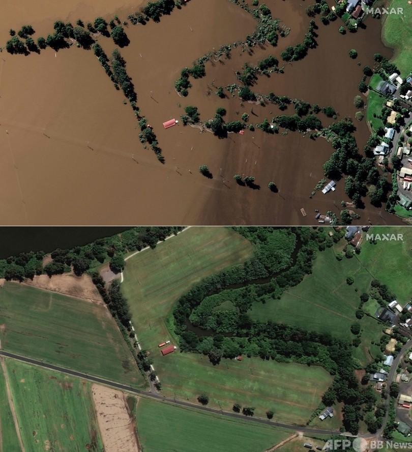 【3月26日 AFP】豪雨に見舞われたオーストラリア東部シドニー近郊ウィンザー(Windsor)の平常時(1月24日)と洪水後(3月25日)を捉えた衛星写真が公開された。